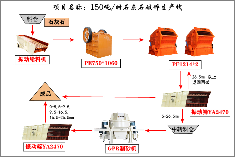 產(chǎn)量:200噸/小時(shí) 物料:以青石(石灰石)為主,輔料為石灰石、鵝卵石石 進(jìn)料要求:≤1000mm 出料要求:≤31.5mm