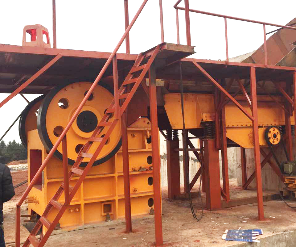 大料斗中的花崗巖由振動(dòng)喂料機(jī)ZSW1100*4200進(jìn)入顎式破碎機(jī)PE-750*1060。原料中含自然風(fēng)沙較多,所以需要篩分,振動(dòng)喂料機(jī)ZSW1100x4200帶有耐磨棒條,間隙為120mm。這種設(shè)計(jì)的好處是把原料中較小顆粒的料預(yù)先分離出來(lái),可以減少顎式破碎機(jī)不必要的負(fù)擔(dān)。