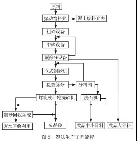生產(chǎn)過程中水作為工作介質(zhì)和抑塵措施,全程參與砂石骨料的生產(chǎn),故稱為濕法工藝。濕法生產(chǎn)工藝一般在水資源較豐富的地區(qū)采用。