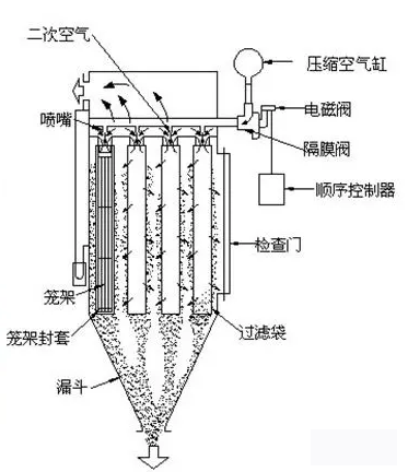 清灰時間間隔過長,附著于濾袋上的粉塵不能及時消除,造成系統(tǒng)阻力增加。一般間隔時間為4s左右(可根據(jù)實際生產(chǎn)情況調整)噴吹,噴吹時間為0.2s~0.3s,室與室的時間間隔為30s左右。