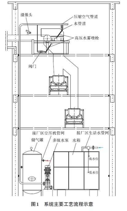 1)在皮帶機機頭罩安裝噴水抑塵裝置:4個高壓水氣混合噴槍通過法蘭螺栓連接分別安裝固定在皮帶機下料斗及皮帶機頭罩上,上下各2個,呈對稱布置。噴淋系統(tǒng)的15m³水箱、1m³儲氣罐及多級水泵集中布置在中轉(zhuǎn)框架底部0平面,高壓水氣混合噴槍通過閥門及主水氣管線實現(xiàn)上下連接。