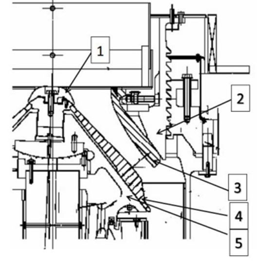 下圖中:1分料盤;2定錐體;3定錐襯板;4動錐襯板;5動錐體