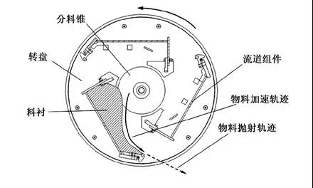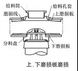 需有針對(duì)性地檢查分料盤的磨損情況,分料盤的磨損將直接加劇下磨損板的磨損速率(分料盤最大磨損處厚度余量<3mm或固定螺栓頂部開始磨損時(shí)必須更換),同時(shí)觀察轉(zhuǎn)子拋料頭磨損位置,確定是否受導(dǎo)料板安轉(zhuǎn)位置和安裝角度影響。